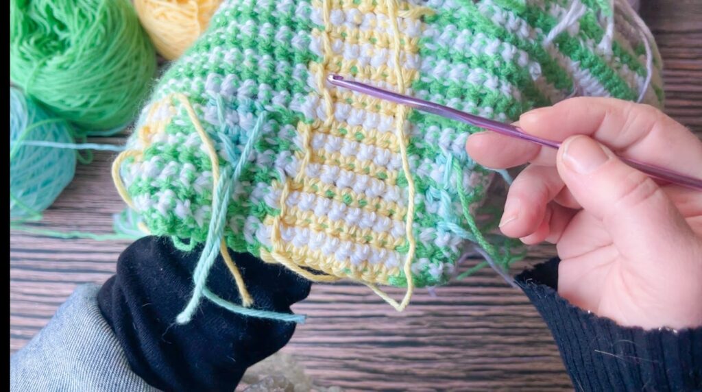 Tips: I worked directly from the balls for the tulip tops and carried the yarn up and over (see video and image below for help) to create the color changes. The same technique is used for all strips in the blanket.