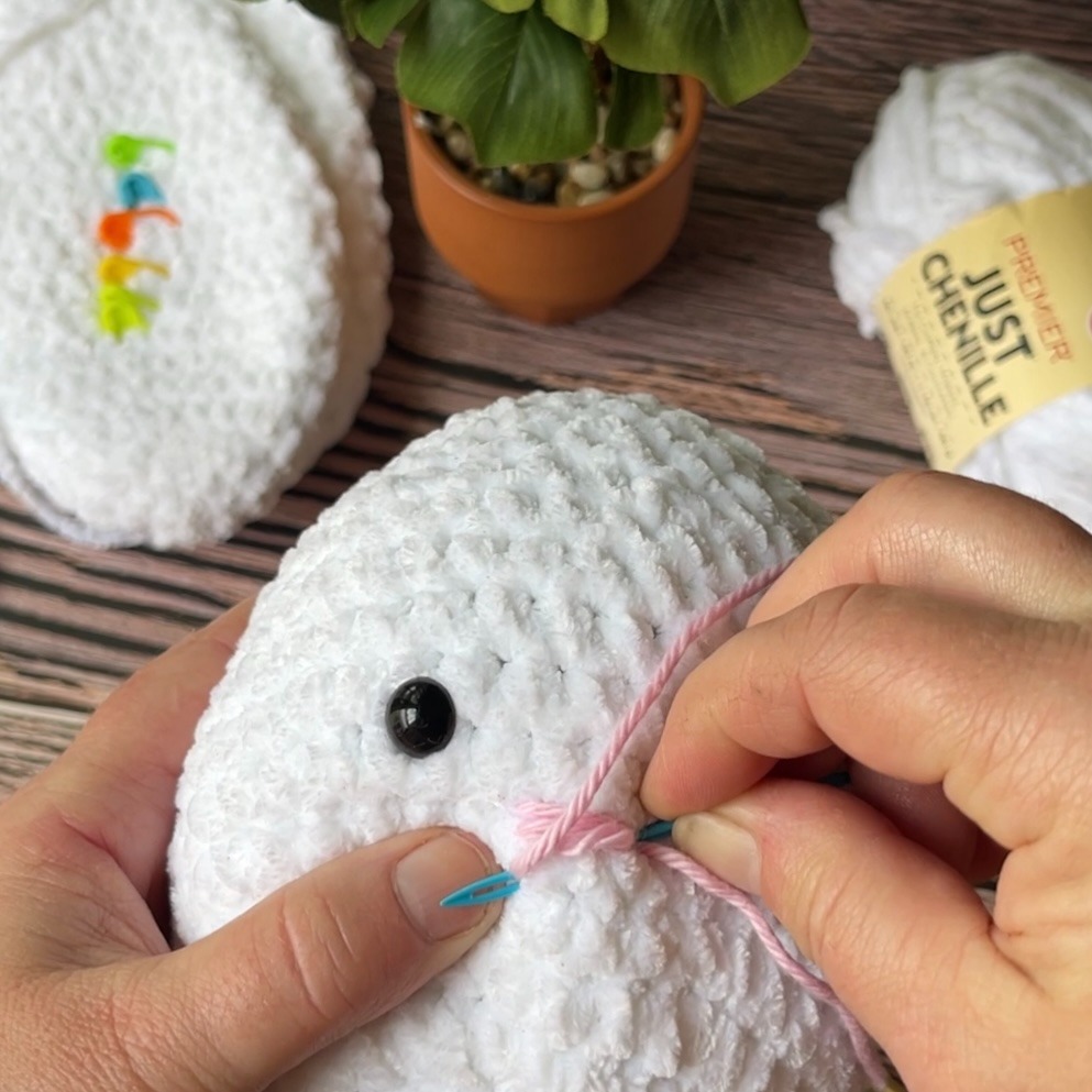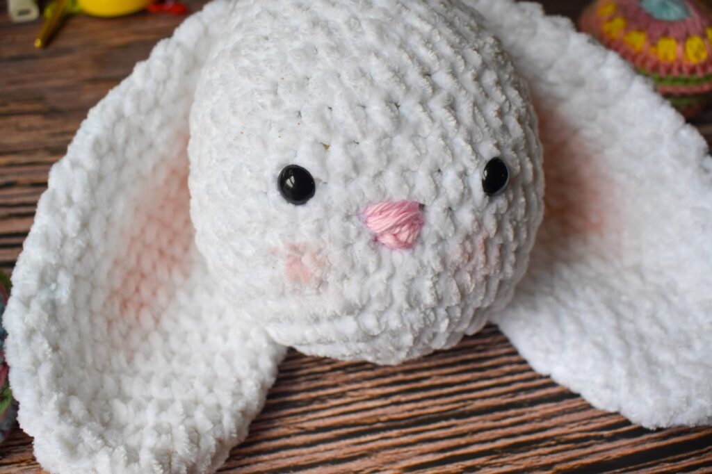 I went with Premier Parfait Just Chenille – trying out Dollar Tree Yarn! Check out my full assembly video and short review on this one here >>> Easter Bunny Assembly and Stitch Guide. This yarn is so soft and great for amigurumi projects and stuffies.