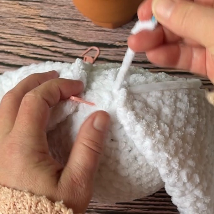 Step 1. Place the ears on top and slightly back as pictured (or wherever you’d like!) Secure with stitch markers.