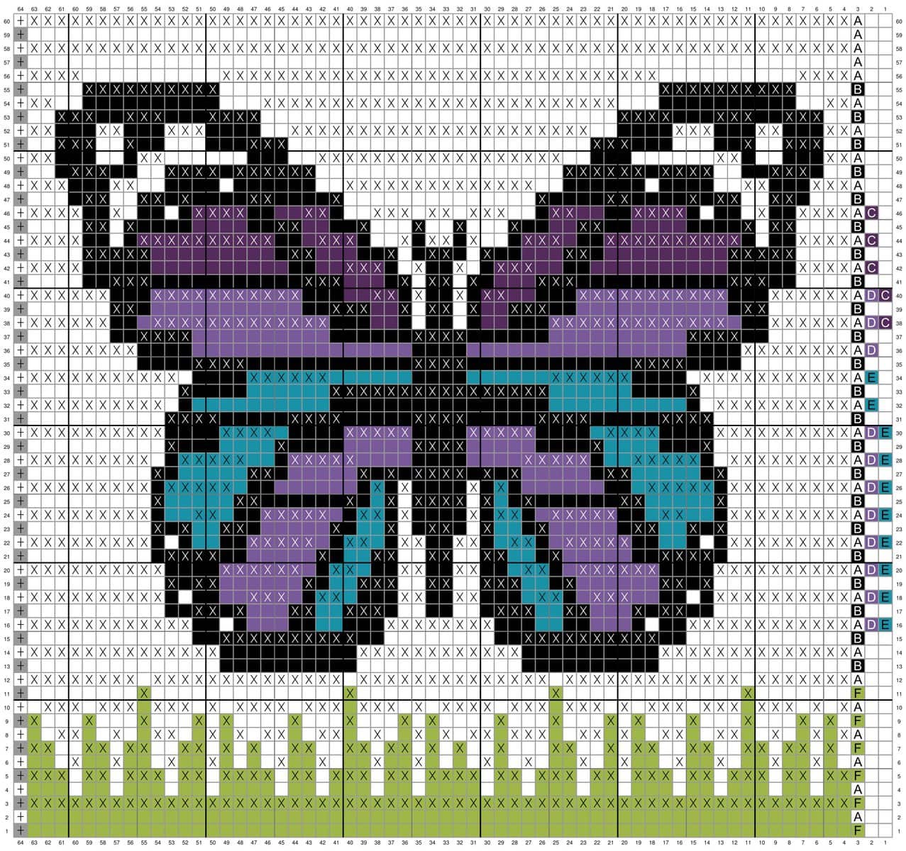 This mosaic crochet pattern works up in vibrant colors: purple, turquoise, black, and spring green against a crisp white background to showcase a delicate butterfly resting on grass.