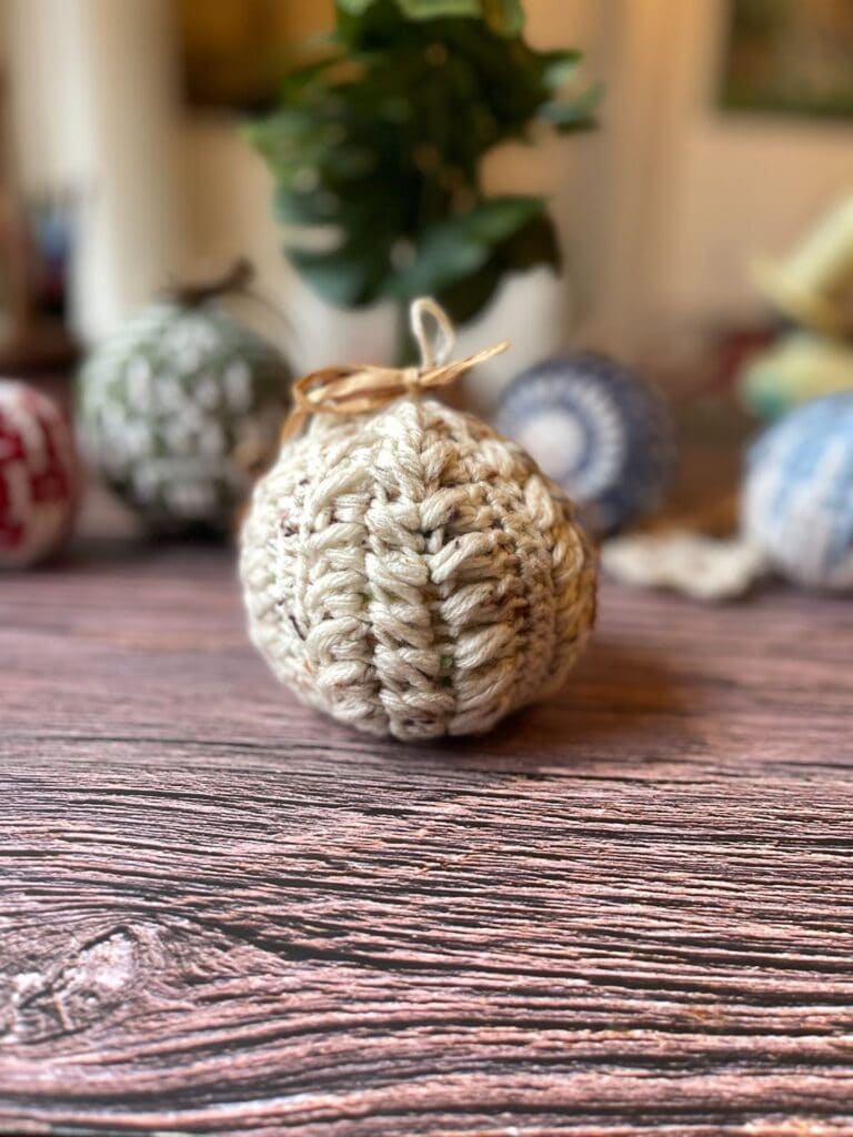 I used Impeccable Tweed Cream – you can use scraps too, it’s a simple pattern. Use a 4 weight for a larger ornament.